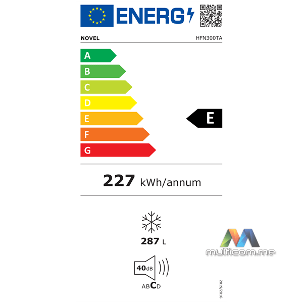 Novel HFN300TA horizontalni zamrzivač │ Energetski razred E │ Nivo buke C │ Boja Bijela │ Ukupna zapremina 287 l │ Kapacitet zamrzavanja 14 kg/24h │ Vreme čuvanja bez struje 40 h │ Godišnja potrošnja ~227 kWh