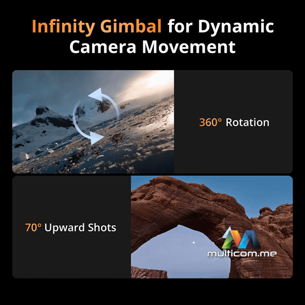 Infinity Gimbal: 360° rotacija omogućava jedinstvene uglove snimanja, dok 70° pogled nagore otključava impresivne vertikalne kadrove.