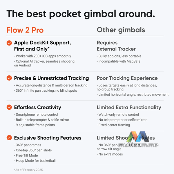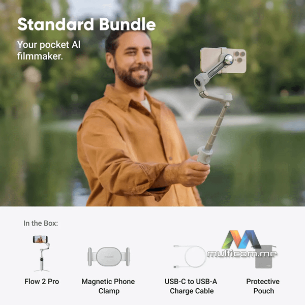 | U pakovanju | 1x Flow2 Pro gimbal, 1x magnetni držač za telefon, 1x magnetna stega za telefon, 1x USB-C na USB-A kabal, 1x zaštitna torba, 1x reflektor |
