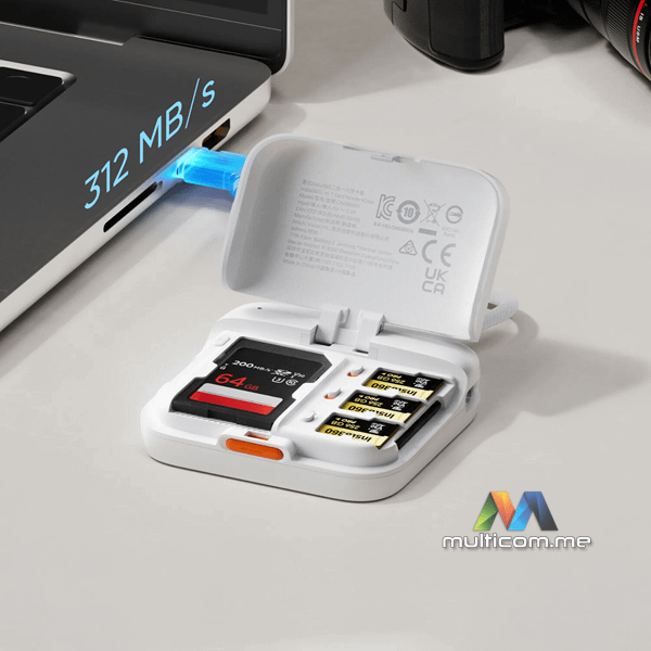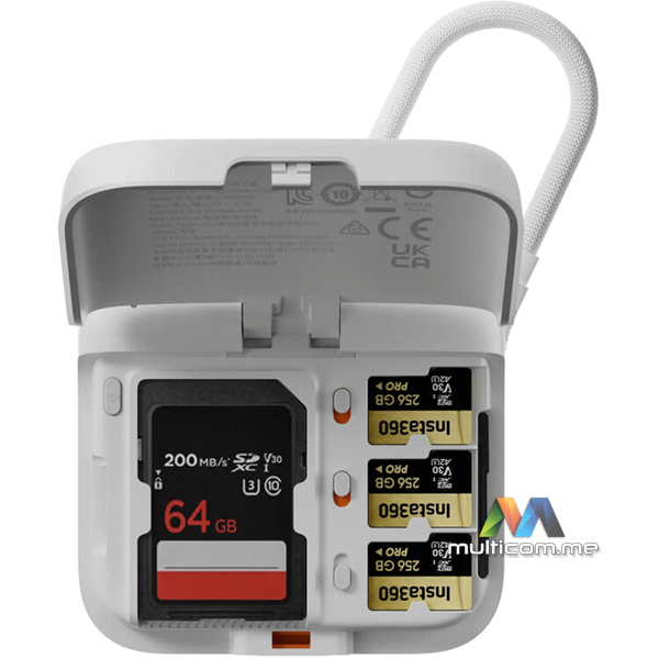 Prenosite memorijske kartice i prebacujte podatke koristeći 2-u-1 Čitač Kartica + Futrola od Insta360, koji ima jedan UHS-II SDXC slot za kartice i jedan UHS-II microSDXC slot za kartice, oba se mogu koristiti istovremeno. Kada se koriste sa UHS-II karticama, podaci se prenose brzinom do 312 MB/s, dok je UHS-I medij ograničen na 170 MB/s. Pored dva namjenska slota za čitač kartica, postoji prostor za čuvanje jedne dodatne SD kartice i tri dodatne microSD kartice. Takođe je podržana kompatibilnost sa Apple uređajima, sa mogućnošću prenosa ProRes 4K60 videa i magnetnog povezivanja putem MagSafe-a. Plug-and-play povezivanje se uspostavlja korišćenjem integrisanog USB-C 3.2 Gen 1 kabla, koji služi i kao traka za nošenje kada nije u upotrebi.