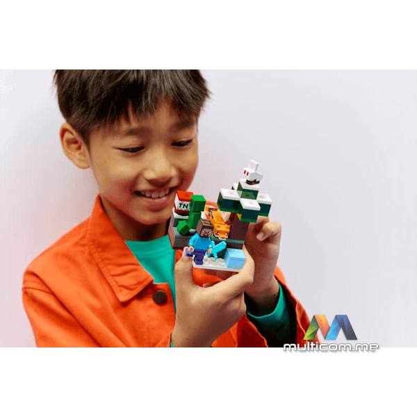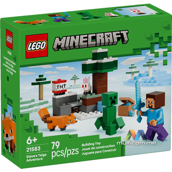 Podignite igru Minecraft® igrača na viši nivo sa "Steve’s Taiga Adventure" (21583), kolekcionim setom za građenje za dječake i djevojčice od 6 godina i više. Ovaj mali LEGO® set je pun akcije, lova na blago i eksplozivne zabave za djecu da istraže uz Steve minifiguru, kao i Creeper™, lisicu i bebu zeca LEGO figure. Djeca se pridružuju jednom od heroja igre, Steveu, dok kopa dijamante u Minecraft tajga biomu, sa njegovim prepoznatljivim smrekama, snijegom i tajga travom. TNT i funkcija eksplozije raznose stijene kako bi otkrili dijamante, koji se mogu čuvati u kovčegu sa blagom. Tu je i neprijateljski Creeper kojeg treba odbiti koristeći Steveov dijamantski mač. Ovaj set je odlična ideja za poklon za Minecraft igrače, LEGO graditelje i ljubitelje gejming dekora. I, uz LEGO Builder aplikaciju, djeca mogu graditi sa samopouzdanjem – zumirati, rotirati u 3D i pratiti napredak uz lako pratljive digitalne instrukcije. Set sadrži 79 dijelova.