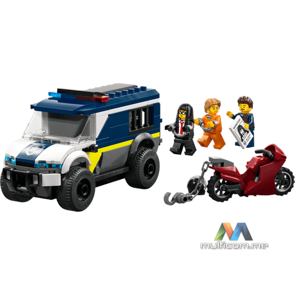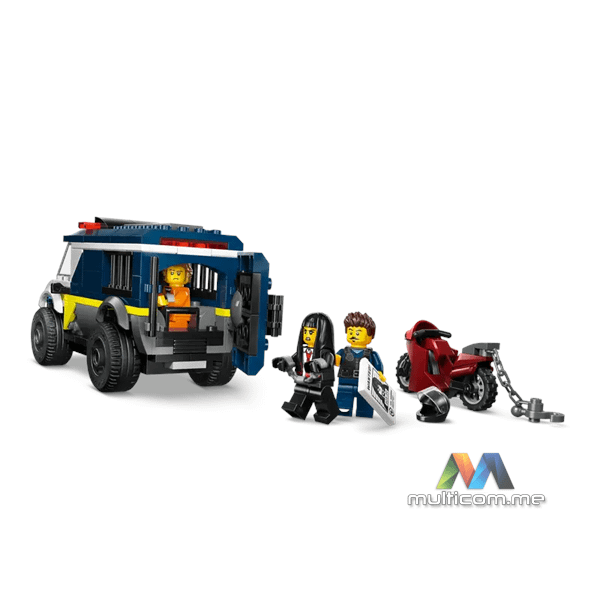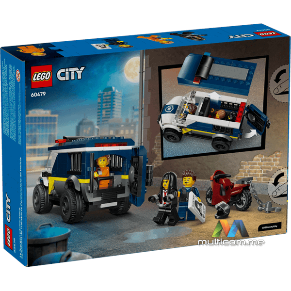 Pripremite se za uzbudljive avanture sa LEGO® City Policijskim Transportnim Kombijem za Zatvorenike (60479) setom za izgradnju za djecu uzrasta 6 godina i više. Model policijskog kamiona ima detaljnu kabinu za vozača i zatvorsku ćeliju sa prostorom za 2 kriminalca. Djeca mogu koristiti igračku motocikl sa lancem i kukom da izvuku vrata iz ćelije. Samo dodajte policajca i 2 figurice kriminalaca za epsku igru bijega iz zatvora. Savršeno za kreativnu djecu i fanove LEGO City Policijskih setova, ovaj komplet za izgradnju policijskog vozila je odličan poklon za rođendan ili bilo koju priliku. Dodajte ovaj set drugim LEGO City igračkama hitne pomoći (prodaju se zasebno) za još više akcije i maštovitog pripovijedanja. Djeca mogu graditi sa samopouzdanjem koristeći LEGO Builder aplikaciju – gdje mogu zumirati, rotirati u 3D i pratiti napredak uz lako pratljive digitalne instrukcije. Set sadrži 198 dijelova.