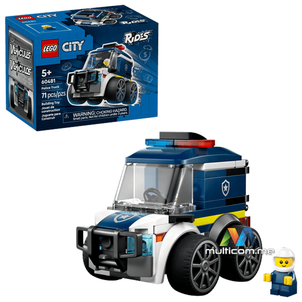 Oslobodi akcijom ispunjene policijske avanture sa LEGO® City Vozilima – Policijski Kamion (60481) mini kompletom za izgradnju za djecu od 5 godina i starije. Ova kompaktna, sklopiva igračka policijski kamion sa kul felgama, niskoprofilnim gumenim gumama, zaštitnim branikom, rešetkama i svjetlima za hitne slučajeve nudi mladim graditeljima zabavan način da istraže svijet LEGO City. Set takođe uključuje LEGO City Vozila policajca junior minifiguru koja savršeno odgovara u kabinu vozača za sate igre pretvaranja. Kao dio LEGO City Vozila kolekcije, ova lako sklopiva igračka policijski kamion je savršena za malu djecu i predstavlja sjajno iznenađenje ili poklon za rođendan za dječake, djevojčice i djecu koja vole igračke automobile i maštovitu igru. Dodajte ga drugim LEGO City setovima (prodaju se odvojeno) za još više avantura. Sa ovim LEGO City Vozila – Policijski Kamion setom za igru, djeca mogu uživati u intuitivnom građenju sa LEGO Builder aplikacijom, zumiranjem i rotiranjem sa 3D instrukcijama, dok čuvaju i prate napredak – sve iz aplikacije. Set sadrži 71 dio.