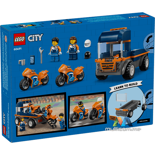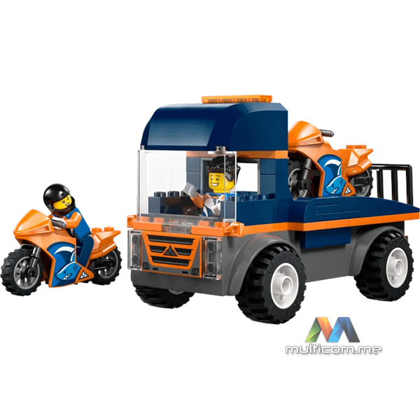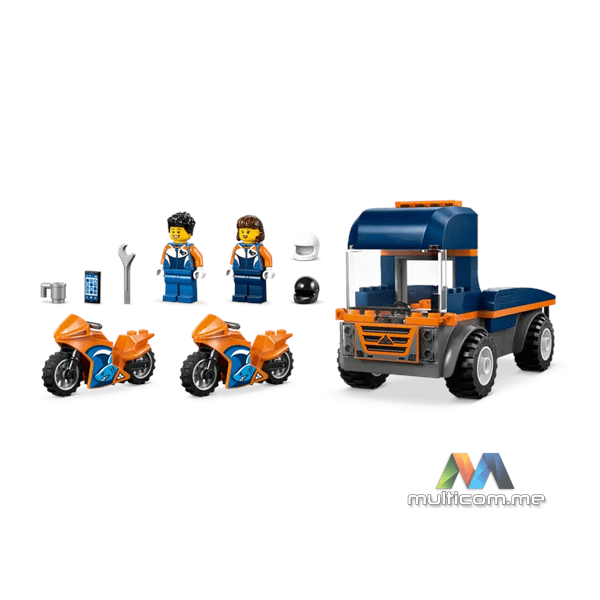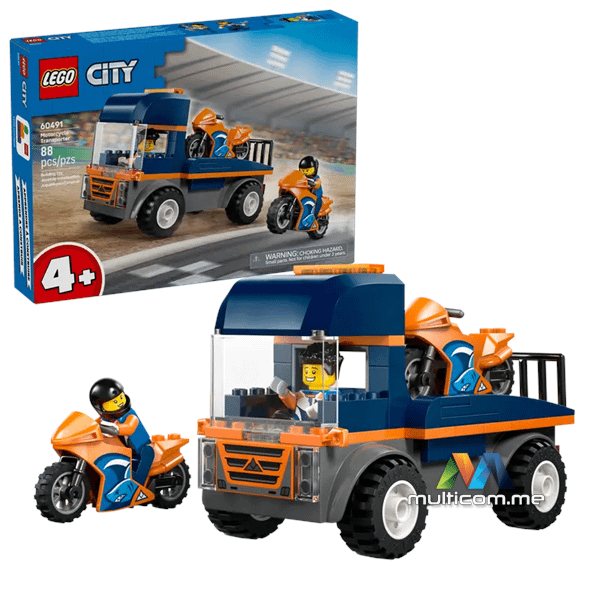 Upoznajte djecu uzrasta 4+ sa svijetom maštovite igre uz LEGO® City Transporter Motocikala (60491) set za građenje igračaka. Ovaj set igračaka vozila uključuje kamion s ravnom platformom sa debelim gumenim gumama, 2 sportska motocikla i 2 minifigure trkača sa kacigama. Djeca mogu utovariti i istovariti bicikle koristeći rampu, odigrati epske trkačke akcije motocikala i smjestiti minifiguru u kabinu za zabavne avanture na putu. Ovaj set igračaka koji se lako gradi uključuje LEGO početnički element, jednostavni slikovni vodič i 3D uputstva u aplikaciji LEGO Builder – digitalni pratilac za građenje sa alatima za zumiranje i rotiranje koji omogućavaju djeci da vizualizuju modele iz svih uglova dok grade. Ovaj set za igru predstavlja zabavan poklon ili rođendanski dar za dječake i djevojčice koji vole trkačke igračke, kreativnu igru i maštovito pripovijedanje. Dodajte ove igračke vozila drugim setovima za građenje (prodaju se zasebno) iz LEGO City asortimana za još uzbudljivije trkačke akcije. Set sadrži 88 dijelova.