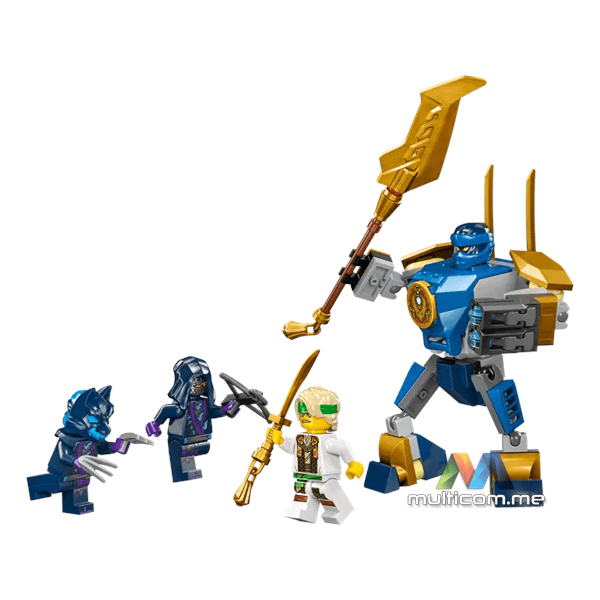 LEGO Jay's Mech Battle Pack lego set │ Uzrast: 6+ │ Komada: 78 │ Figurice: Jay, Master Lloyd, Wolf Mask Claw Warrior, Wolf Mask Guard │ Oružje: Zlatni mačevi, samostrel, kandže │ Visina mech-a: 8 cm