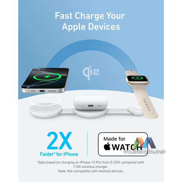 ANKER B25M8H21 MagGo White bežični 3-u-1 sklopivi punjač │ 15W bežično punjenje │ Kompatibilno sa iPhone, Apple Watch i AirPods