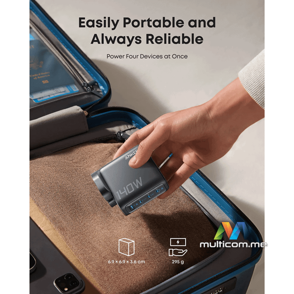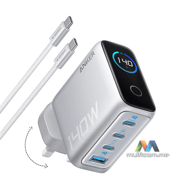 ANKER B2697G41 140W 4-port foldable GaN zidni punjač │ 4-porta (3x USB-C i 1x USB-A) │ USB-C M/M pleteni kabl