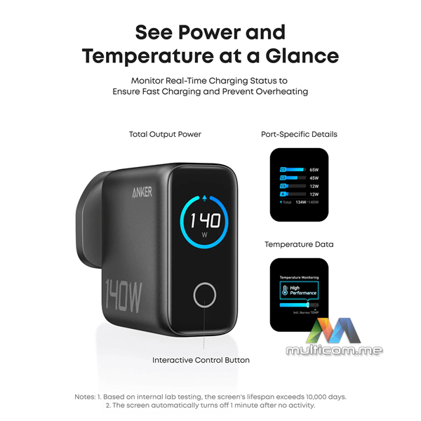 Pratite jednostavno i jasno: Ekran visoke definicije u boji pruža detaljan pregled statusa punjenja, temperature i detalja o portovima, držeći vas potpuno informisanim.