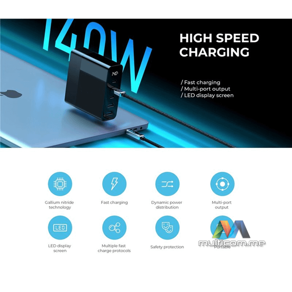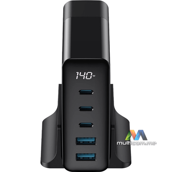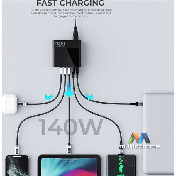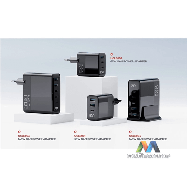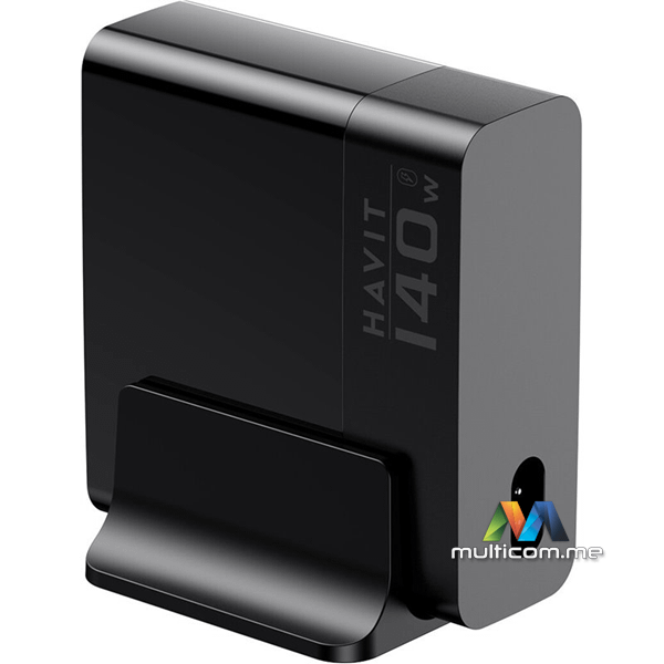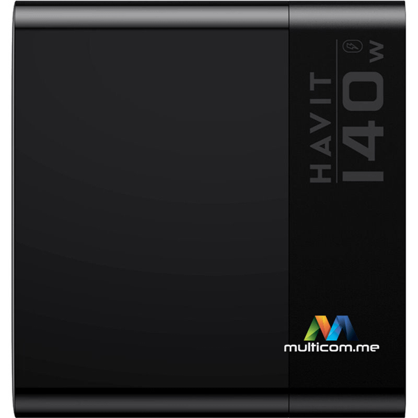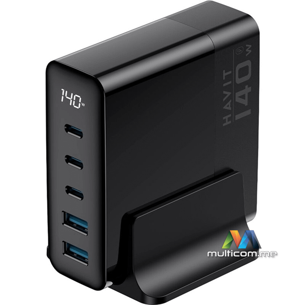 HAVIT UCLE004 EU 140W punjač │ 140W snaga │ GaN tehnologija │ 4 porta │ LED ekran │ Odvojivi držač │ Višestruke zaštite