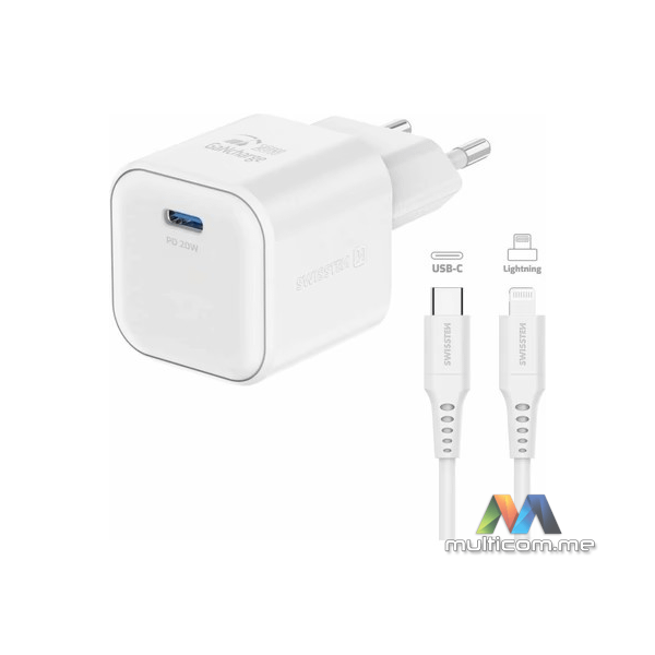 Swissten 1xUSB-C 20W Travel charger + data cable USB-C/Lightning 1.2, white │ Ulaz: 100–240V AC (0.5A, 50/60Hz) │ USB-C izlaz: do 20W │ PPS1: 17.7W max │ PPS2: 19.8W max