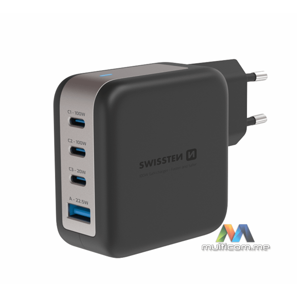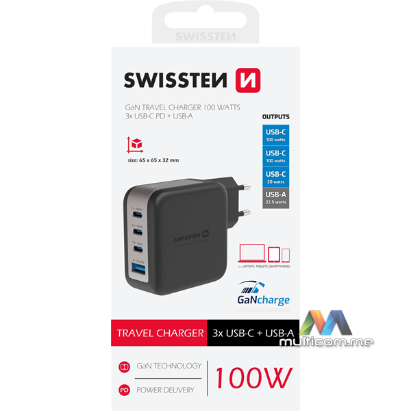 Swissten 100W GaN 3x USB-C + USB-A Travel Charger punjač │ Dimenzije: 65×65×32 mm │ Težina: 217 g │ Ulaz: AC 100-240V, 50/60Hz, 1.5A │ USB-C1/C2 izlaz: do 100W │ USB-C3 izlaz: do 20W │ USB-A izlaz: do 22.5W │ Ukupna snaga: do 95W │ PPS podrška: Da (na USB-C portovima)