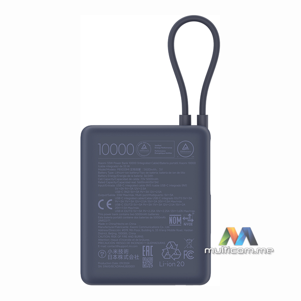 Xiaomi 33W Power Bank 10000 (Integrated Cable) Ice Blue │ Kompaktan dizajn │ Integrisani USB-C kabl │ Brzo punjenje do 33W │ Kapacitet 10,000mAh