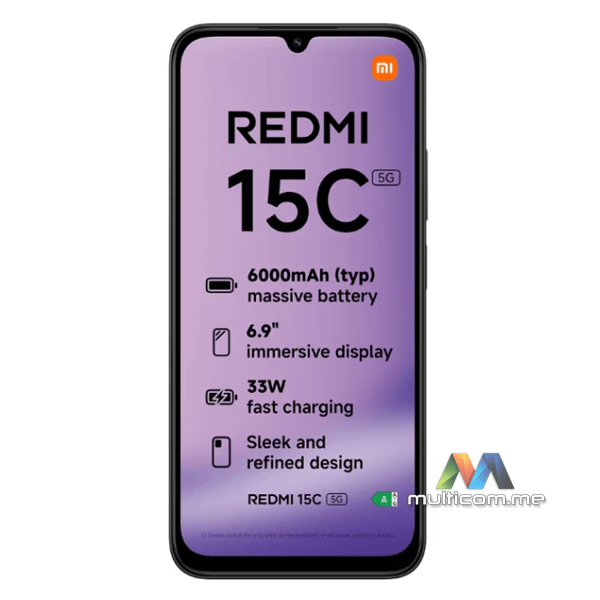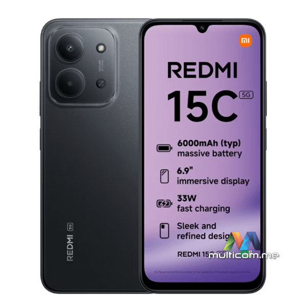 Xiaomi Redmi 15C 5G 4GB 128GB Black smartphone │ 6000mAh baterija │ 33W turbo punjenje │ 6.9-inch 120Hz ekran │ TÜV MediaTek Dimensity 6300 │ Xiaomi HyperOS 2 │ 50MP AI dvostruki kamerni sistem │ IP64 otpornost na prašinu i vodu