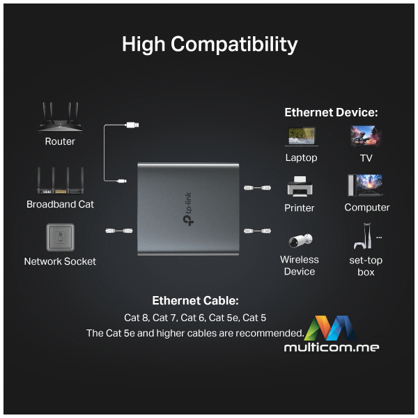 Visoka Kompatibilnost: EH210 je kompatibilan sa Cat 8/7/6/5e/5 mrežnim Ethernet kablovima i može se koristiti sa čvorištima, prekidačima, ruterima, bežičnim uređajima, računarima i drugim.