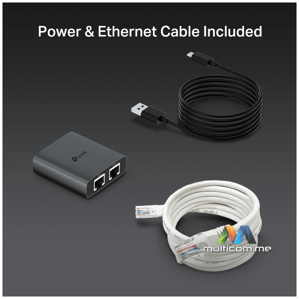 Uključeni Napajanje i Ethernet Kabl: Paket uključuje USB-C napajanje i Cat 5e kabl, sa kojima možete jednostavno priključiti i koristiti.