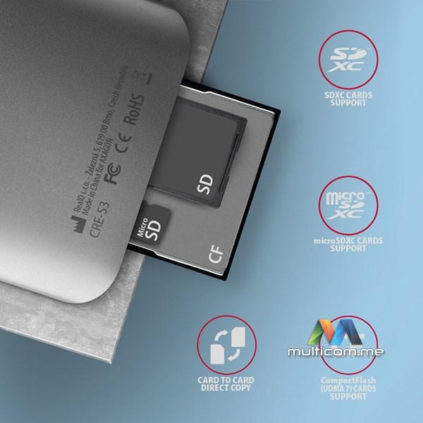 Aluminijumski 3-u-1 čitač memorijskih kartica AXAGON CRE-S3 SUPERSPEED sa USB 3.2 Gen 1 interfejsom podržava sve aktuelne verzije SD i microSD kartica, uključujući SDXC i microSDXC kapaciteta do 2 TB. Takođe podržava CF kartice kapaciteta do 128 PT.