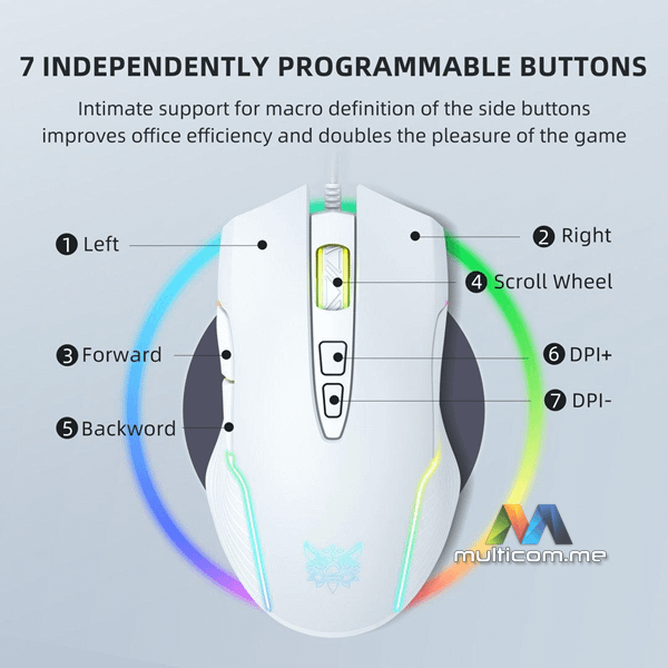 ONIKUMA CW905 je opremljen sa 7 tastera, uključujući lijevi i desni taster miša, točkić/središnji taster, taster za naprijed, za nazad, kao i DPI i DPI-. Ova pametna raspodjela omogućava brze reakcije i efikasno upravljanje tokom igranja i svakodnevnih zadataka.