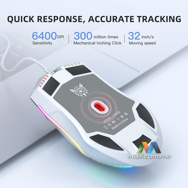 ONIKUMA CW905 je gejmerski miš koji ti omogućava da biraš između 6 nivoa DPI osjetljivosti – svaki nivo omogućava preciznije praćenje pokreta ruke i glatko pomjeranje kursora. Pored toga, miš ima 7 tastera: lijevi, desni, točkić/središnji taster, naprijed, nazad, DPI i DPI-, tako da najvažnije funkcije uvijek imaš nadohvat ruke. ONIKUMA CW905 se takođe osvjetljava u 6 različitih boja, čime se može savršeno prilagoditi tvom stilu. Sve to upotpunjuje ergonomski dizajn napravljen od materijala lakih za čišćenje.