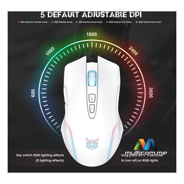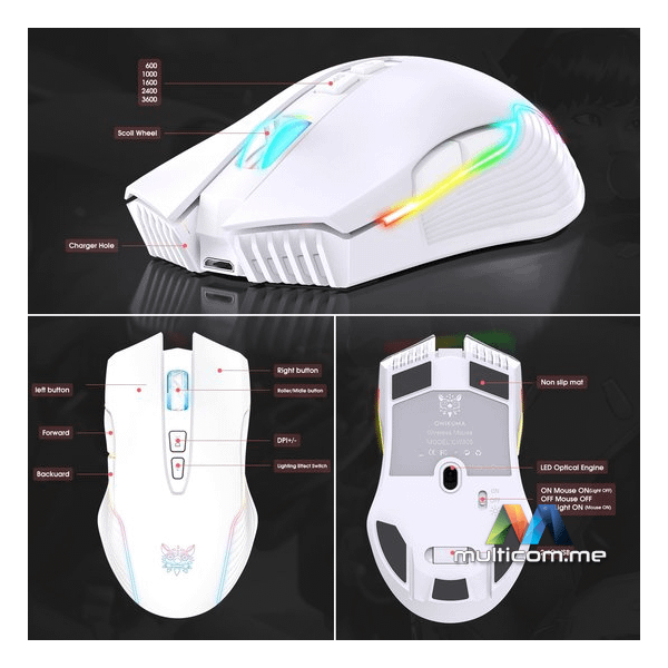 ONIKUMA CW905 Wireless White bežični gaming miš │ DPI 600–3600 │ 5 nivoa DPI │ 2.4G wireless │ Do 48h rada │ RGB osvjetljenje │ 700mAh baterija │ Domet 10m
