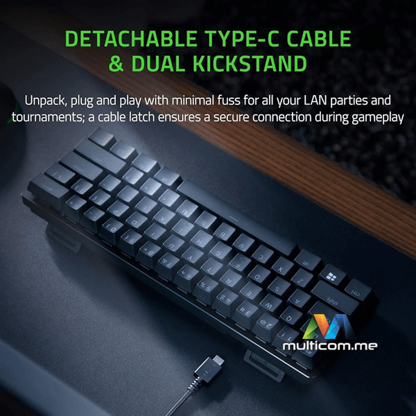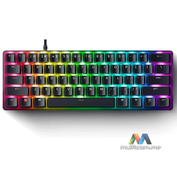 | Ostalo | "Razer™ Snap Tap", Standardni raspored donjeg reda, Aluminijumska konstrukcija, 60% Kompaktan oblik, Ugrađeni svjetlosni preseti, Omogućeno "Razer Synapse 3", Potpuno programabilni tasteri sa snimanjem makroa u letu, N-key roll-over sa ugrađenim anti-ghostingom, Opcija za gejming mod, 1000 Hz Ultrapolling |