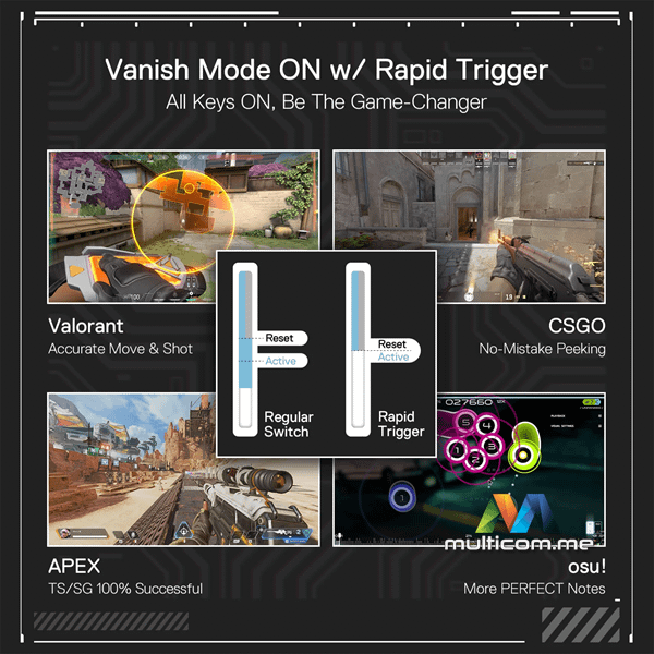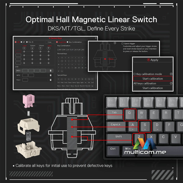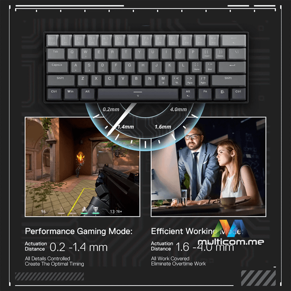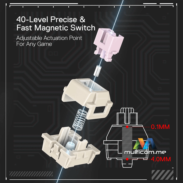 Kombinacijom Hall magnetnog prekidača i Rapid Trigger funkcije putem softvera, tačka aktivacije se može precizno podešavati u opsegu od 0.3 mm do 4.0 mm, u koracima od 0.1 mm (efikasnost ispod 0.3 mm može varirati zbog tolerancije komponenti). Ova tehnologija omogućava ultra-preciznu aktivaciju i deaktivaciju tastera – savršeno za jedan dodir = jedan pogodak.