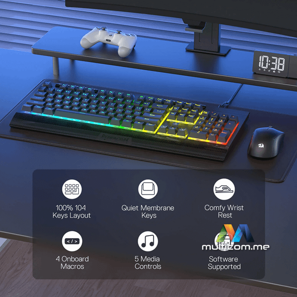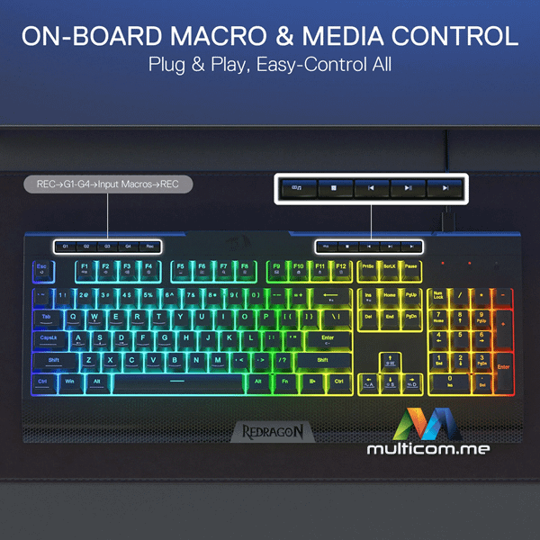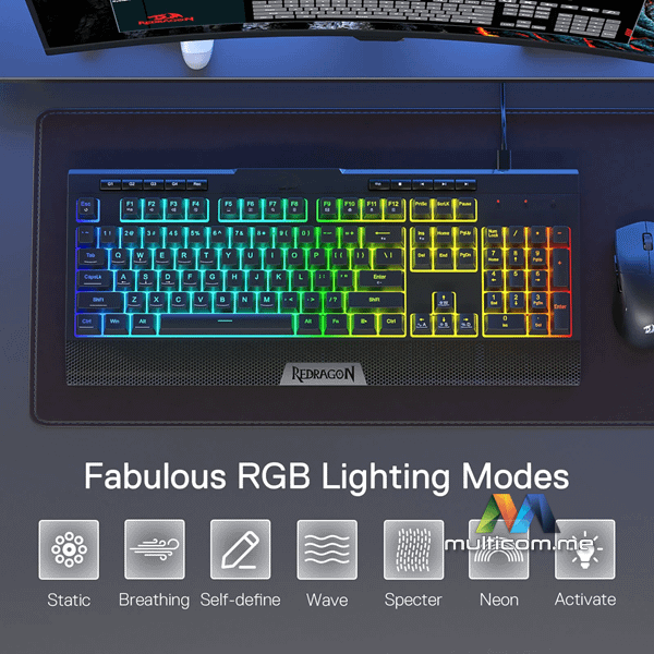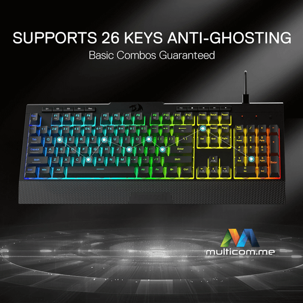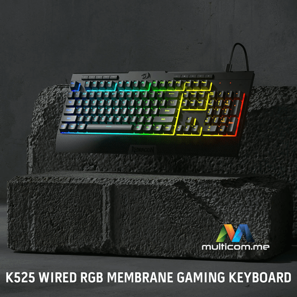 Redragon Shiva Lite K525 Black RGB Wired gaming tastatura │ 4 programabilna makro tastera │ Dinamično RGB osvjetljenje │ 26 anti-ghost tastera │ Posvećene medijske kontrole │ Ergonomski naslon za zglob