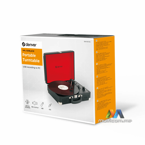 DENVER VPL-120 Black gramofon │ Retro dizajn │ Višestruke brzine reprodukcije │ Prijenosni dizajn kofera │ Ugrađeni zvučnici │ Phono izlaz │ Auto-stop ručica