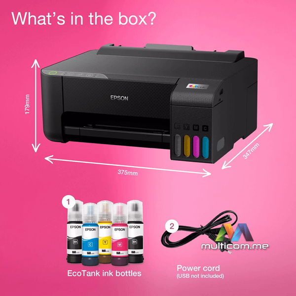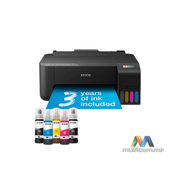 EPSON EcoTank L1270 A4 štampač u boji (C11CJ71407) │ Tehnologija štampe: Epson Micro Piezo™ │ Broj boja: 4 boje │ Brzina štampe (ISO/IEC 24734): 10 str./min crno-bijelo, 5 str./min u boji │ Rezolucija štampe: 5.760 x 1.440 DPI │ Kapacitet ladice: 100 listova │ Povezivanje: USB, WiFi, Wi-Fi Direct │ Težina: 2,9 kg │ EAN: 8715946727295