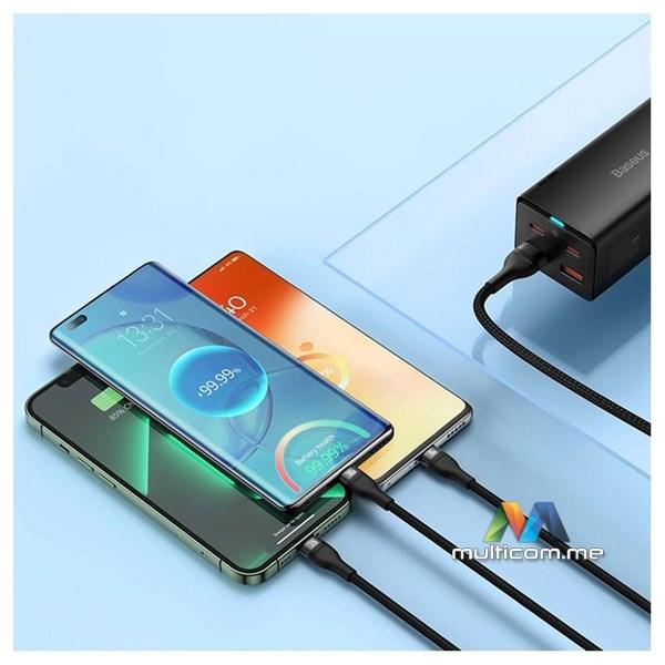 Praktično punite do 3 uređaja u isto vrijeme. USB 3 u 1 kabl Baseus Flash serija je opremljena sa 3 konektora - USB-C, lightning i micro USB. Omogućava brzo punjenje sa do 100W snage. Također vam omogućava prijenos datoteka brzinom do 480 Mbps (na USB-C / lightning konektoru). Istovremeno je izuzetno izdržljiv i osigurava sigurnost upotrebe.