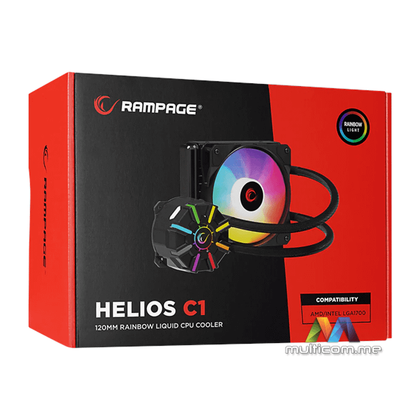 Rampage HELIOS C1 vodeno hlađenje za procesor │ Brzina pumpe: 2600 ± 10% RPM │ TDP: 150W │ Kompatibilnost AMD: FM2 / FM1 / AM3+ / AM3 / AM2+ / AM2 / AM4 │ Kompatibilnost Intel: LGA115X / 1366 / 17XX / 2011 / 2066 │ Veličina ventilatora: 120x120x25mm │ Maksimalni protok vazduha: 68CFM