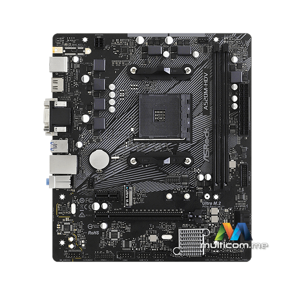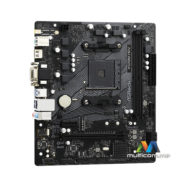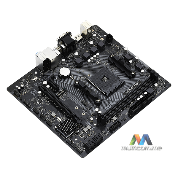 ASRock A520M-HDV matična ploča │ AMD AM4 Ryzen socket │ 6-fazni dizajn napajanja │ Podrška za DDR4 4733+ (OC) │ PCIe 3.0 x16 i x1 slotovi │ 4 x SATA3 i 1 x Ultra M.2 │ 6 x USB 3.2 Gen1 │ 6 x USB 2.0
