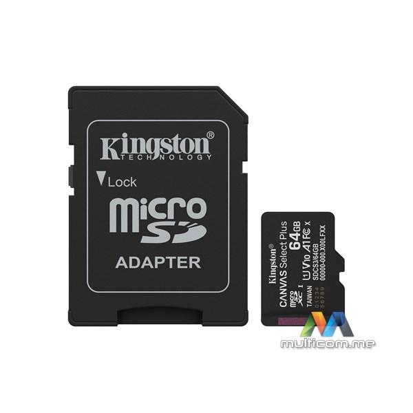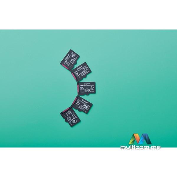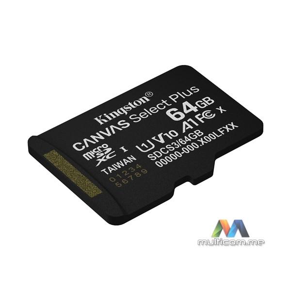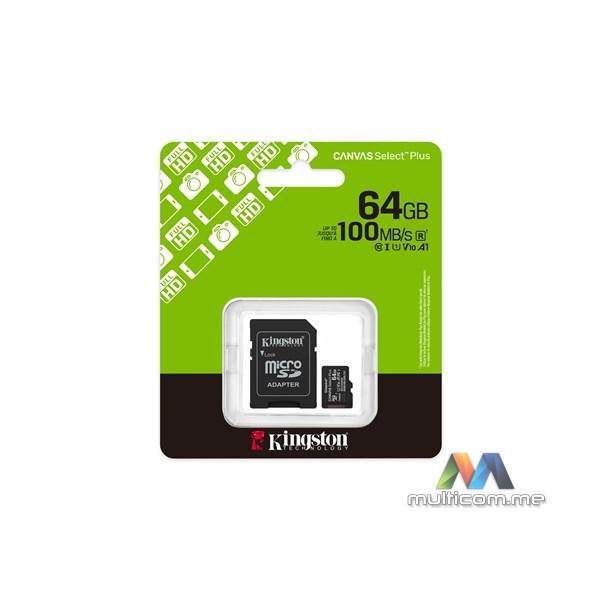 Kingston Canvas Select Plus 64GB microSD + SD adapter │ Kapacitet: 64 GB │ Tip kartice: MicroSDXC │ Brzina čitanja: 100 MB/s │ Klasa brzine: Class 1 (U1) │ Klasa video-brzine: V10 │ Klasa performansi: A1