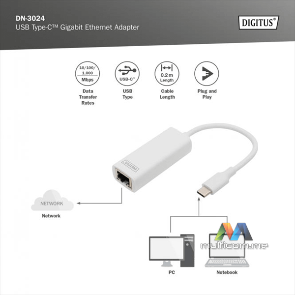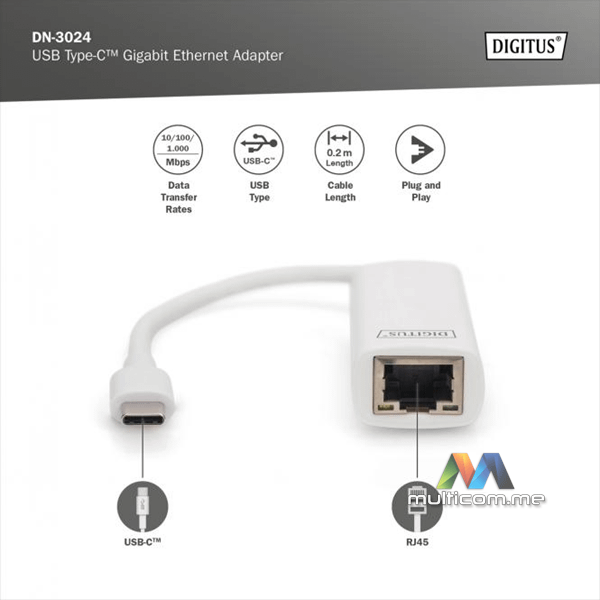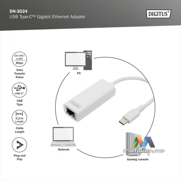 Digitus USB Type-C Gigabit Ethernet Adapter │ USB Type-C 3.0 │ Gigabit Ethernet 10/100/1000 Mbps │ Čipset: RTL8153