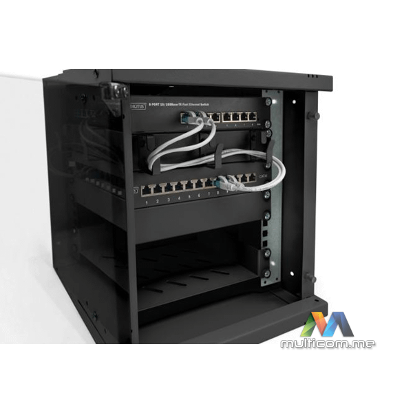Digitus DN-49101 6U (10") mrežni ormar │ Klasa zaštite: IP20 │ Vrata: Sigurnosna staklena vrata sa 200° uglom otvaranja │ Kapacitet opterećenja: 30 kg │ Dimenzije proizvoda: 325 x 315 x 300 mm │ Boja: Crna, RAL 9005 │ EAN: 4016032493631