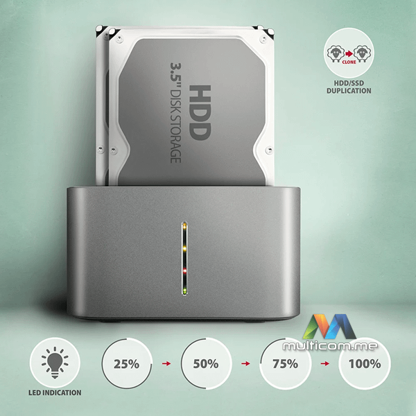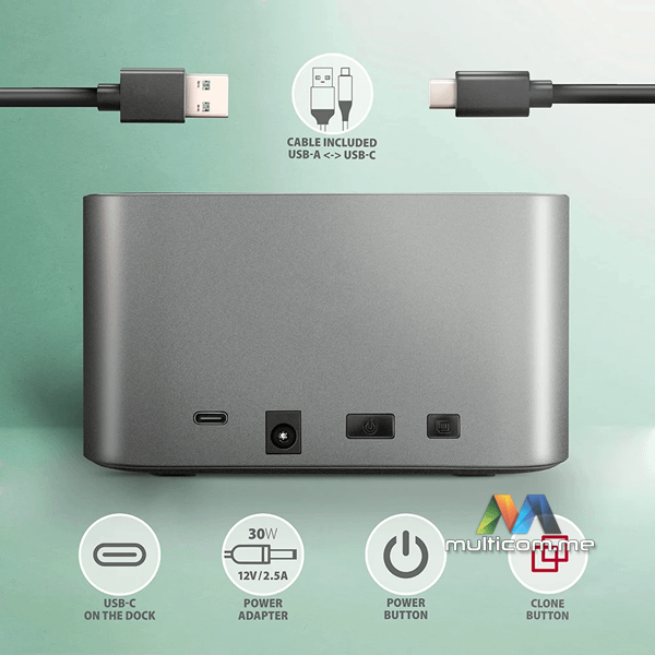 | Funkcija kloniranja diska: | • Kloniranje se odvija bez povezivanja stanice sa računarom. • Ciljni disk mora imati isti ili veći kapacitet kao izvorni disk, inače kloniranje ne može biti pokrenuto. • Moguće je klonirati i HDD i SSD. • Brzina kloniranja do 300 MB/s. • Ukupno vrijeme kloniranja diska zavisi od kapaciteta izvornog diska, a ne od količine podataka na disku. |