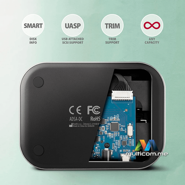 | Podrška za uređaje: | • SATA III - 6 Gb/s (600 MB/s) interfejs, • Podržava 2.5" HDD/SSD • Podržava 3.5" HDD. • Maks. kapacitet diska – sve bez ograničenja. • Maks. visina 2.5" diska - sve bez ograničenja. |