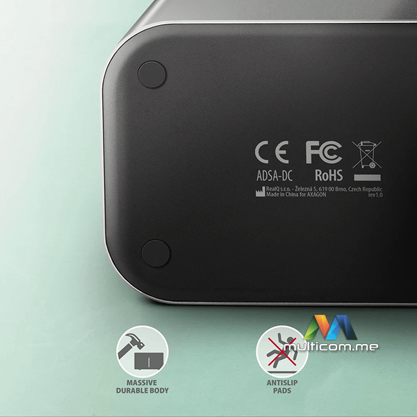 Kućište stanice je dovoljno robusno i izdržljivo, što omogućava savršenu stabilnost čak i sa umetnutim diskovima. Gumene protivklizne podloge sprečavaju klizanje na stolu i vibracije tvrdih diskova. Vanjsko kućište je napravljeno od aluminijuma sa elegantnom brušenom površinom.