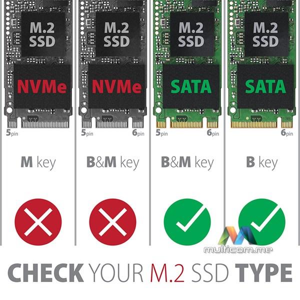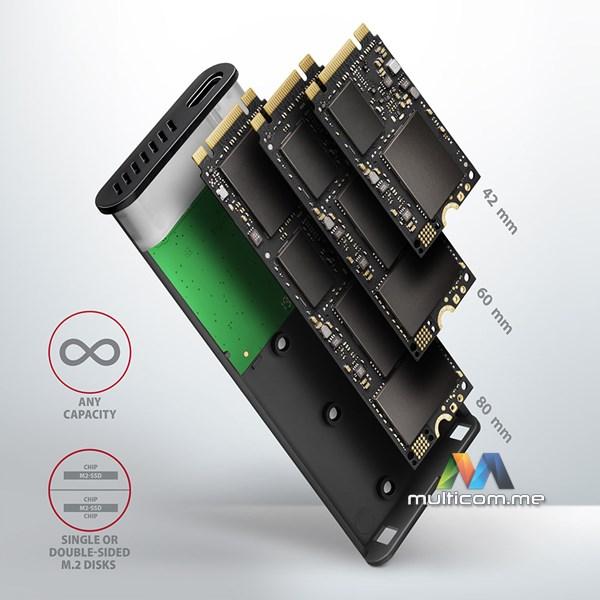 U kućištu se mogu koristiti SATA M.2 SSD diskovi. Prednost je mogućnost ugradnje SSD kartica različitih dužina – 42, 60 i 80 mm. M.2 kartice mogu biti jednostrane ili dvostrane. Kućište ne ograničava kapacitet ubačenog SSD-a.