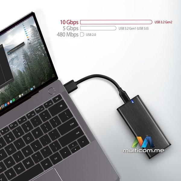 Ubacivanjem M.2 SSD-a u kućište lako se dobija brz, kompaktan eksterni disk. Kućište se može koristiti sa računarima i laptopovima, kao i sa mobilnim telefonima i tabletima.