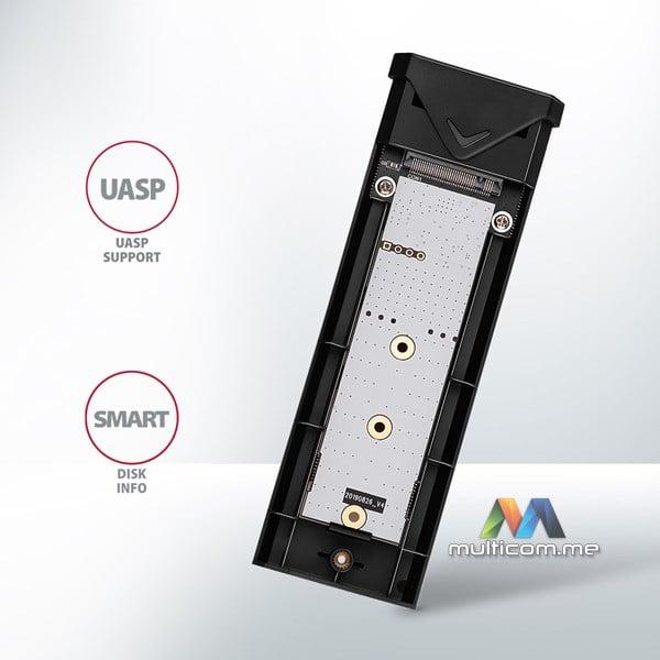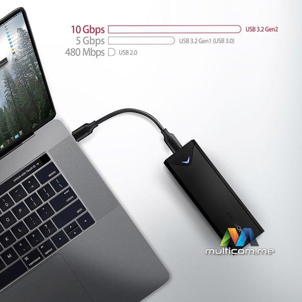 Brzina prenosa je do 10Gb/s zahvaljujući brzom USB 3.2 Gen 2 interfejsu. Eksterna M.2 kutija takođe podržava druge moderne funkcije kao što su UASP, TRIM i omogućava čitanje informacija o statusu diska S.M.A.R.T. Podrška za stanje pripravnosti kada je neaktivna.