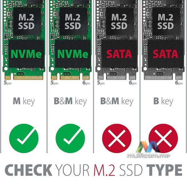 Prednost je pričvršćivanje tri različite dužine SSD kartica - 42, 60 i 80 mm. M.2 diskovi mogu biti jednostrani ili dvostrani. Kutija ne ograničava kapacitet umetnutog SSD-a.