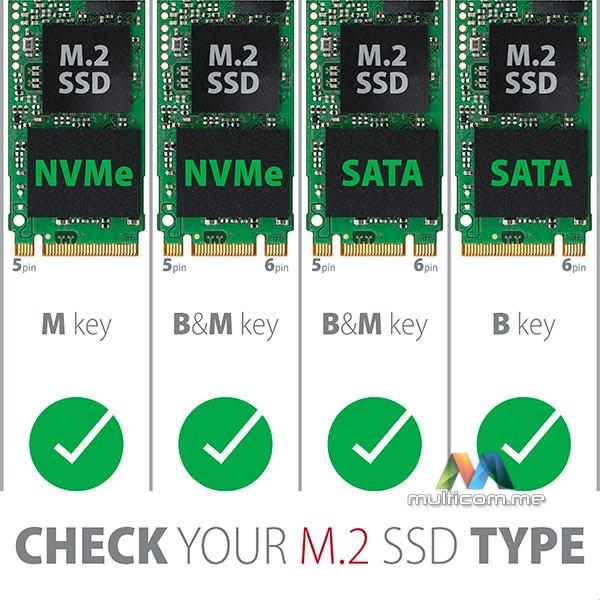 Adapter podržava upotrebu jednostranih i dvostranih SATA i NVMe (PCI Express) M.2 SSD-ova. Redukcija ne ograničava kapacitet SSD-a, i mogu se koristiti bilo koje M.2 kartice dužine do 110 mm. Istovremeni rad oba diska je uobičajen.
