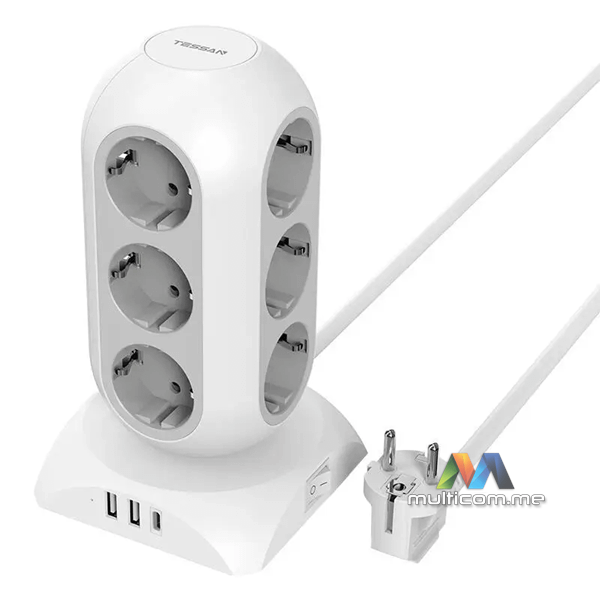 Tessan TPS02-DE-C produžni kabl │ Boja: Bijela │ Schuko utičnice: 12 │ USB: 2x USB-A (5V, 2.4A), 1x USB-C (5V, 3A) │ Višestruka utičnica idealna za kancelarijsku i kućnu upotrebu