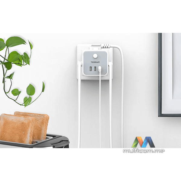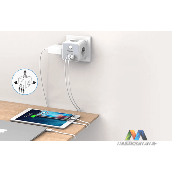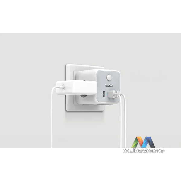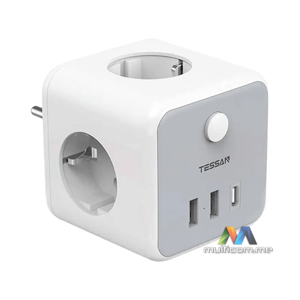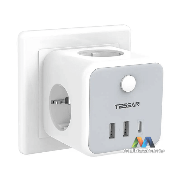 Tessan TS-301-DE-C zidna utičnica │ Boja: Bijela │ Priključci: 3x AC utičnice, 2x USB-A, 1x USB-C │ Maksimalna snaga: 2500 W │ Struja: 10 A │ Dimenzije: 7.6 x 7.6 x 7.6 cmi