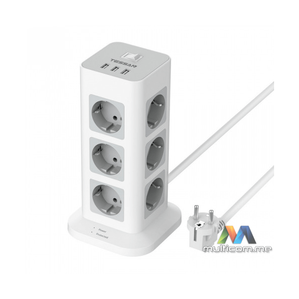 Tessan TS-TPS04-DE produžni kabl │ 12 Schuko utičnica │ 3 USB porta │ Kabl 2m │ Prekidač za napajanje │ Zaštita od prenapona 900J │ Maks. zaštita do 7500A │ 4 gumene nožice za stabilnost