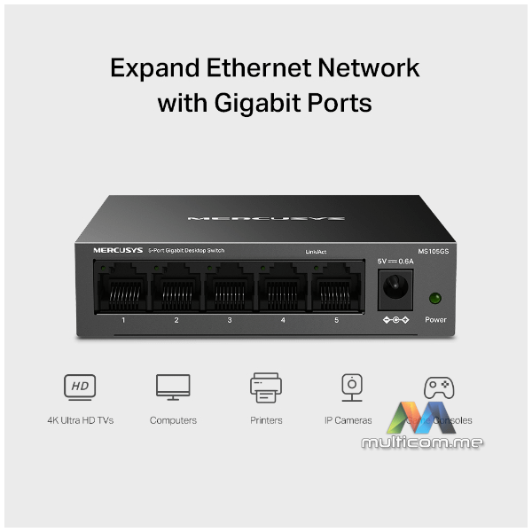 Mercusys MS105GS 5-Port Gigabit Desktop Switch │ 5 Gigabit portova │ Čelično kućište │ Plug and Play