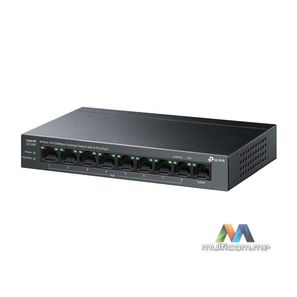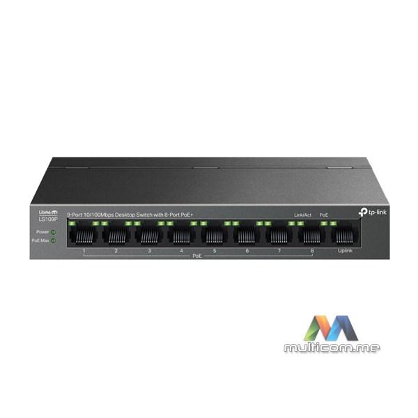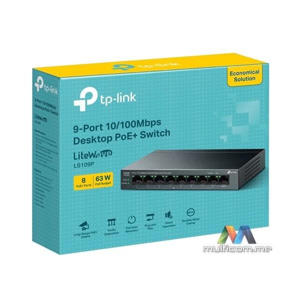 TP-Link LiteWave LS109P 9-portni desktop svič od 10/100 Mbps sa 8 PoE+ portova │ 8 PoE+ portova │ 63 W PoE budžet │ Plug and Play │ Izdržljivo metalno kućište