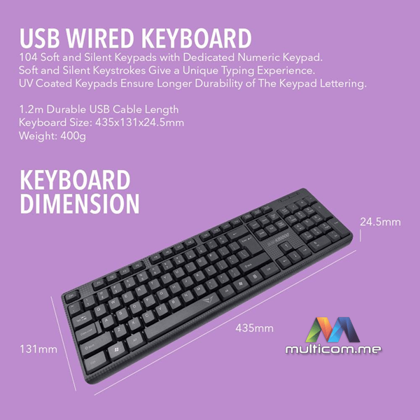 USB žična veza: 104 tastera sa numeričkim dijelom, 1.2m kabl, UV premaz za dugotrajniju čitljivost tastera