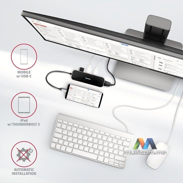 Port replikator je idealan dodatak za laptope bez USB-A konektora i video izlaza. Možete koristiti vaše trenutne USB periferije bez potrebe za kupovinom novih. Zahvaljujući Plug and Play i Hot Plug funkcijama, povezivanje samog huba je vrlo jednostavno bez komplikovane instalacije, a periferije se takođe lako mogu povezati i odvojiti dok računar radi. Hub se ne plaši povezivanja sa telefonima sa USB-C konektorom. Možete povezati flash disk, tastaturu, miš, monitor, TV ili projektor na vaš telefon.
