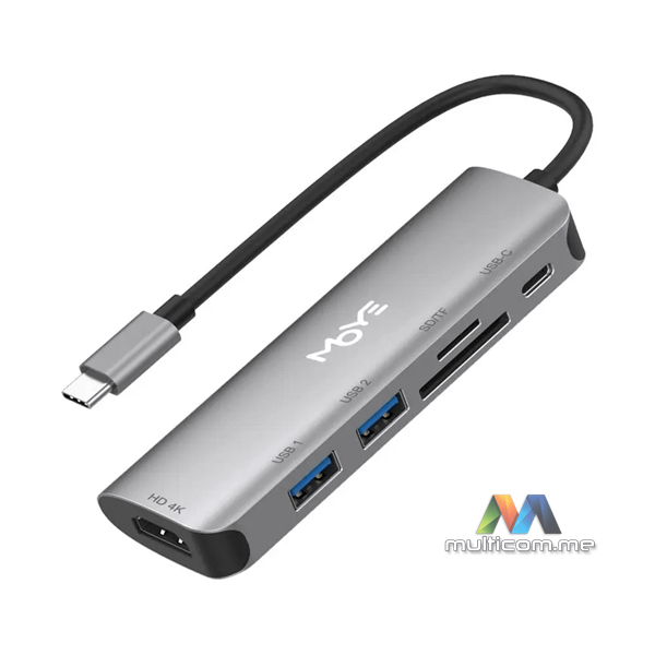 Moye Core multiport X6 HUB │ Konektori: 1 x HDMI, 1 x SD/TF čitač kartica, 1 x USB-A 3.0 Gen 1, 1 x USB-A 2.0, 1 x USB-C PD 3.0 │ USB-C priključni konektor │ Power Delivery podrška
